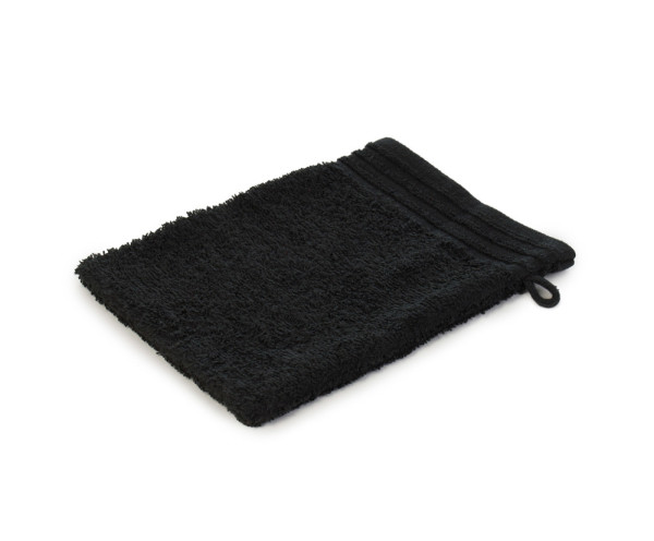 Uni-Walk-Frottier Waschhandschuh mit spannungsfreier 3-Streifen-Tiefgang-Bordüre, 4-seitig gesäumt, bestehend aus 100% hochwertiger Baumwolle, Größe 16x21cm, ca. 400 g/m², Farbe schwarz