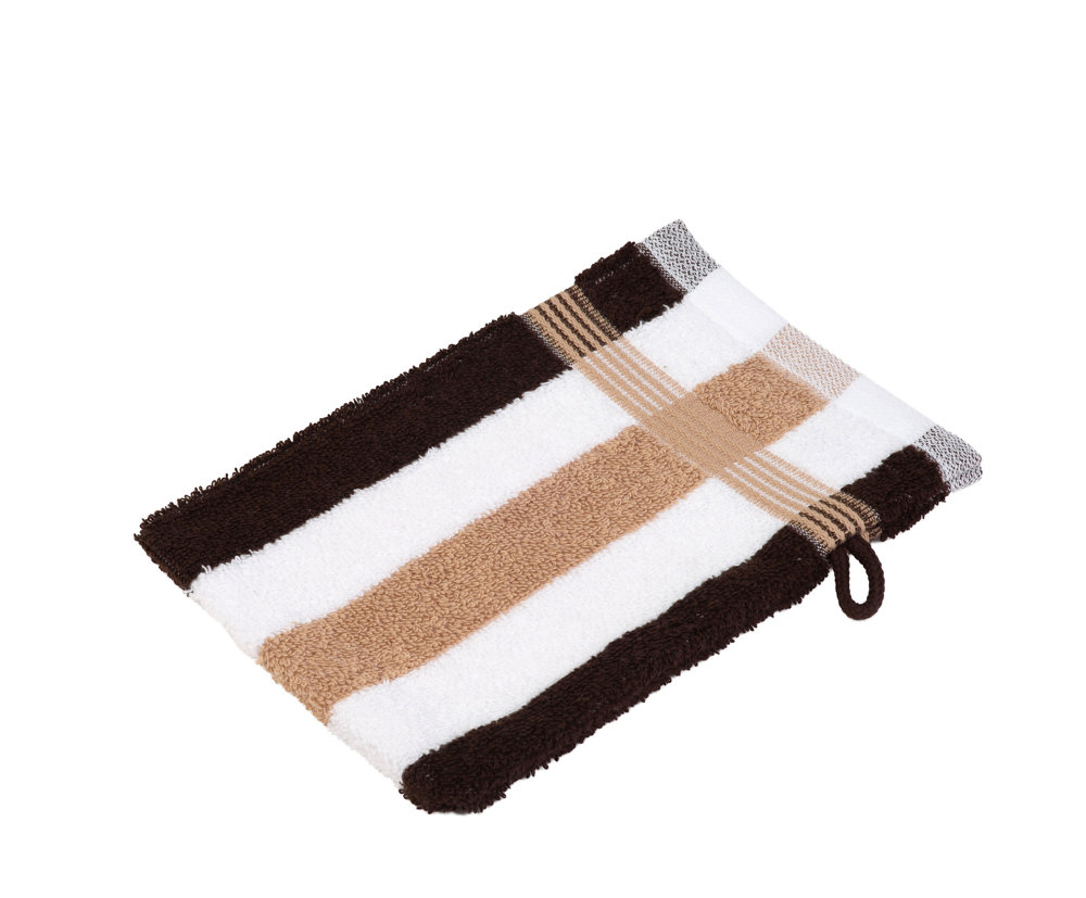 Mehrfarbig gestreiftes Frottier Waschhandschuh mit strukturierter Spannungsfreier Baumwollborte. Extra flauschige, volumenstarke, stabile Grundkonstruktion. Ca. 550g/m²