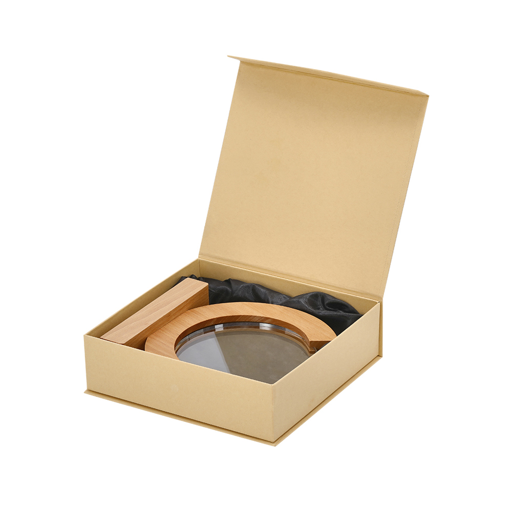 Trophäenplatte aus dickem Glas mit elegantem rundem Design und Holzsockel. Ideal für personalisierte Geschenke, Anerkennungen, Auszeichnungen und Dekorationen. Präsentiert in einer individuellen Schutzhülle mit Kraft-Finish.