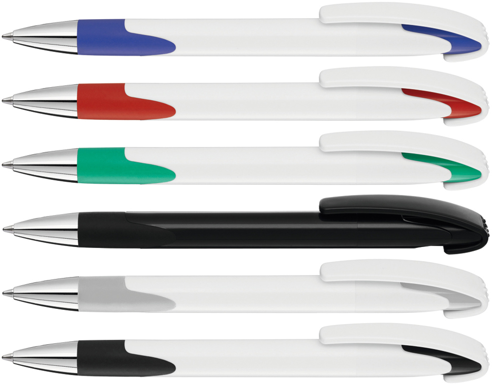 Druckkugelschreiber mit gedeckt glänzendem Gehäuse, Gummigriffzone und schwerer Metallspitze glanzverchromt.