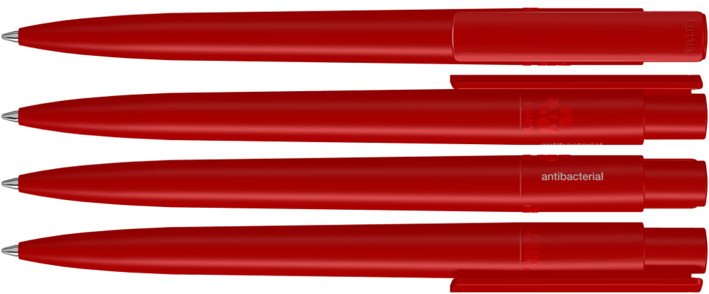 Druckkugelschreiber aus recyceltem, antibakteriellem und antiviralem rPET in gedeckt glänzendem Gehäuse und Clip. Der nach ISO 22196 und ISO 21702 geprüfte antimikrobielle Zusatz verleiht dem rPET eine antibakterielle und antivirale Wirkung auch gegen Corona-Viren. Die Haftung und Ansiedlung von Bakterien oder Krankheitserregern auf der Oberfläche des Schreibgerätes wird um 99,99% verringert. Der in das rPET Material eingearbeitete antimikrobielle Zusatz kann nicht abgerieben oder abgegeben werden und wirkt über die gesamte Lebensdauer des Schreibgerätes. Eine dauerhafte Reduzierung von Krankheitserregern ist gegeben.