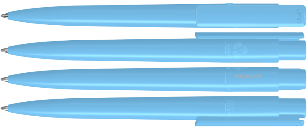 Druckkugelschreiber aus recyceltem, antibakteriellem und antiviralem rPET in gedeckt glänzendem Gehäuse und Clip. Der nach ISO 22196 und ISO 21702 geprüfte antimikrobielle Zusatz verleiht dem rPET eine antibakterielle und antivirale Wirkung auch gegen Corona-Viren. Die Haftung und Ansiedlung von Bakterien oder Krankheitserregern auf der Oberfläche des Schreibgerätes wird um 99,99% verringert. Der in das rPET Material eingearbeitete antimikrobielle Zusatz kann nicht abgerieben oder abgegeben werden und wirkt über die gesamte Lebensdauer des Schreibgerätes. Eine dauerhafte Reduzierung von Krankheitserregern ist gegeben.