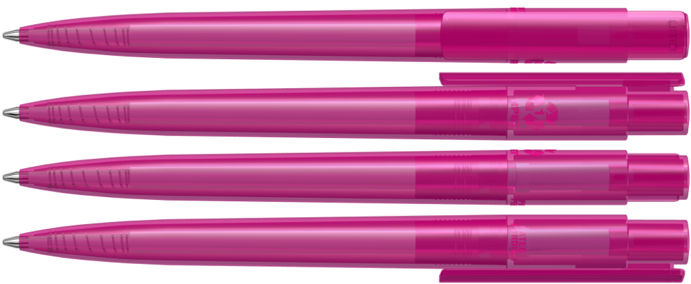 Druckkugelschreiber aus recyceltem PET-Material mit transparent glänzendem Gehäuse und Clip.