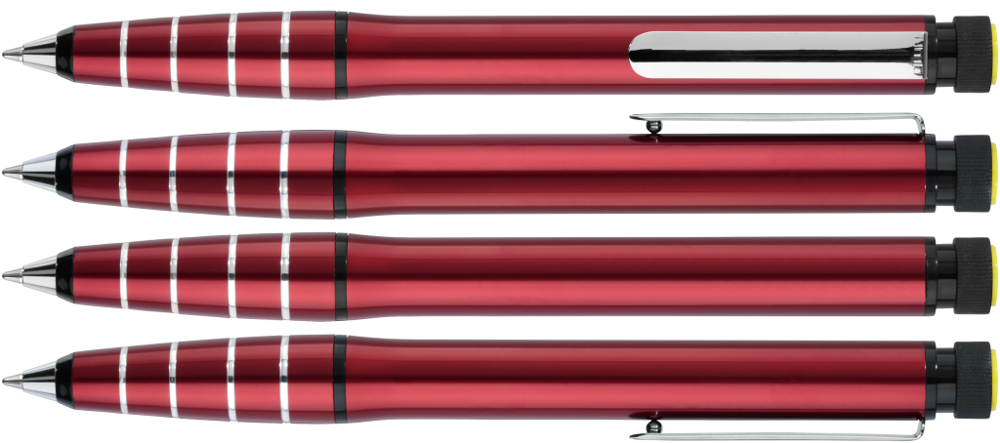 Metall-Drehkugelschreiber aus Aluminium mit integriertem gelb schreibenden Textmarker im Schaft. Der Textmarker lässt sich mittels Drehbewegung aus dem Schaft herausnehmen und kann separat genutzt werden.