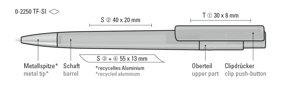 Druckkugelschreiber aus recyceltem PET-Material mit transparent gefrostetem Gehäuse und Clip sowie Metallspitze aus recyceltem Aluminium in silber matt.