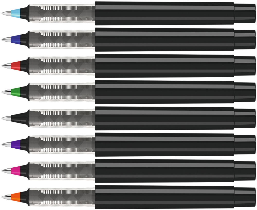 Rollerball mit Gehäuse aus recyceltem PET-Material in gedeckt glänzend weiß oder schwarz. Stopfen in den 8 möglichen Schreibfarben.