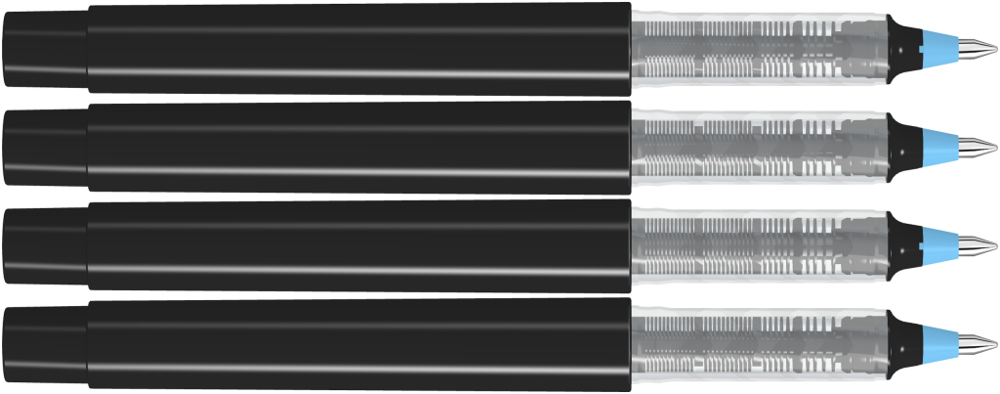 Rollerball mit Gehäuse aus recyceltem PET-Material in gedeckt glänzend weiß oder schwarz. Stopfen in den 8 möglichen Schreibfarben.