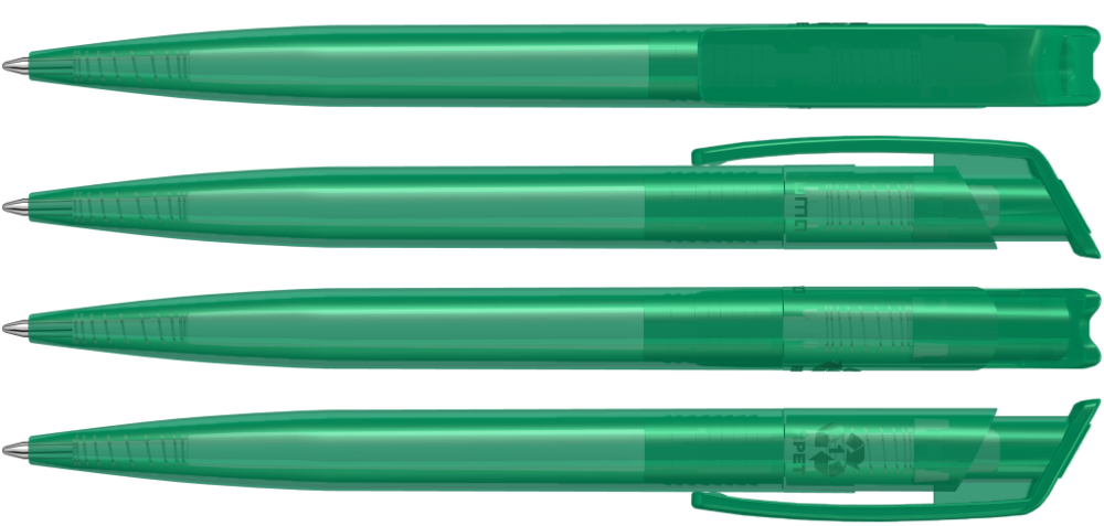 Druckkugelschreiber aus recyceltem PET-Material mit transparent glänzendem Gehäuse und gedecktem Stopfen.