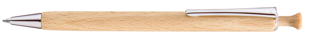Holz-Druckkugelschreiber mit Holzdrücker, Metallclip und Metallspitze silber glänzend. Schaft und Drücker aus schutzlackiertem PEFC-zertifiziertem Buchenholz.