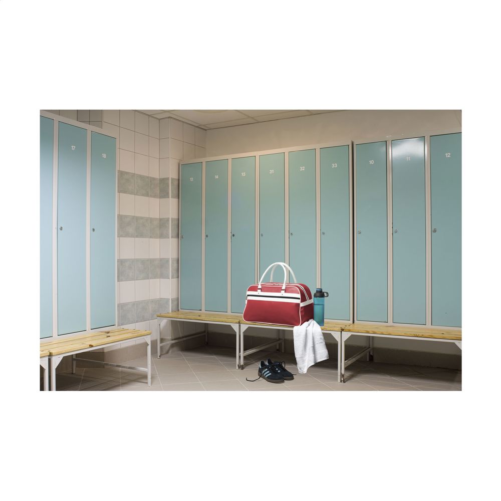PVC/PU Sporttasche im 70er Jahre-Look mit gefütterter Innenseite, Hauptfach und Reißverschlussfach, 2 stabilen Handgriffen, Einlegeboden und Schutznoppen. Stilvoll verarbeitet mit hochwertigen Materialien, die eine extra lange Lebensdauer garantieren. Fassungsvermögen ca. 21,5 Liter.