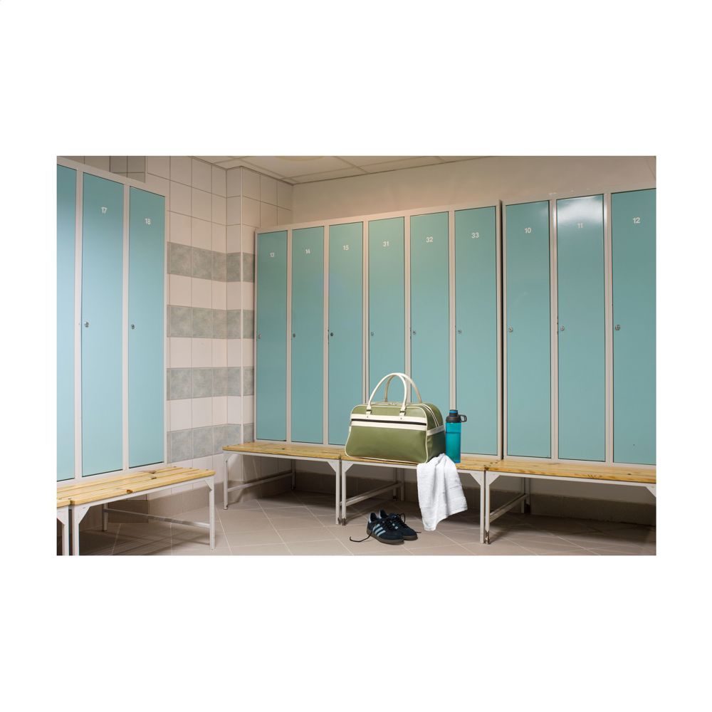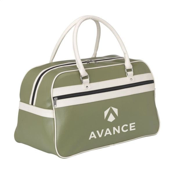 PVC/PU Sporttasche im 70er Jahre-Look mit gefütterter Innenseite, Hauptfach und Reißverschlussfach, 2 stabilen Handgriffen, Einlegeboden und Schutznoppen. Stilvoll verarbeitet mit hochwertigen Materialien, die eine extra lange Lebensdauer garantieren. Fassungsvermögen ca. 21,5 Liter.