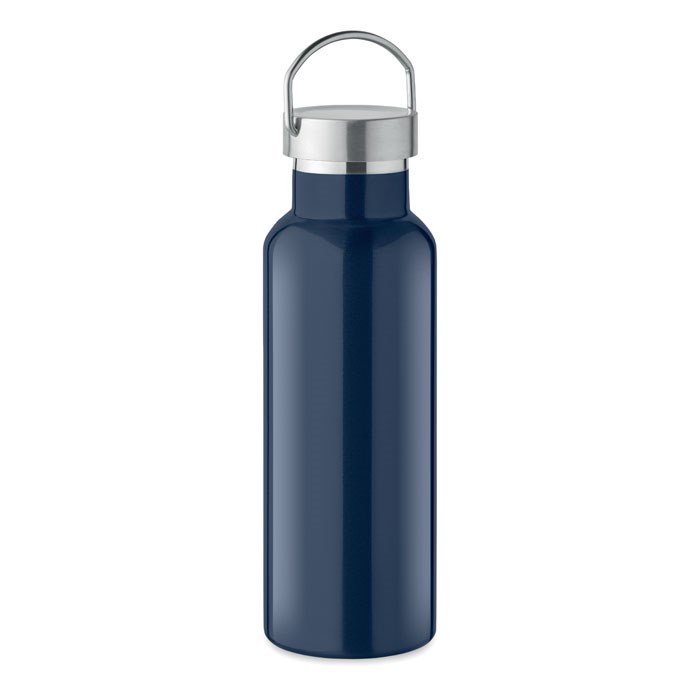 Doppelwandige Isolierflasche aus recyceltem Edelstahl (90 % recycelter Edelstahl und 10 % Edelstahl). Verschluss mit Henkel. Füllmenge: 500 ml.
