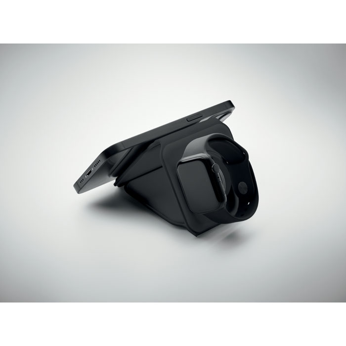 Zusammenfaltbare Ladestation 3in1. ABS. Sie verfügt über 3 kabellose Ladepunkte. Eingang: 2-in-1 Typ-C und Typ-A. 15 W. Auch kompatibel mit der iWatch.