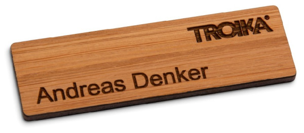 Holz-Namensschilder sind ideal, um einen „natürlichen“ Eindruck zu machen und einzigartig im Auftritt durch die individuelle Maserung des Naturmaterials. Das Namensschild Lignum | Comfort im dezenten Format 60x20 mm wird individuell mit Logo und Namen lasergraviert. Material: Kirsche, weitere Holzarten (Ahorn, Bambus, Birke, Walnuss) sind erhältlich. Das Holz-Namensschild ist mit einer kleiderschonenden Magnet-Befestigung ausgestattet und sofort einsatzbereit. Format- und Befestigungsalternativen sind verfügbar.