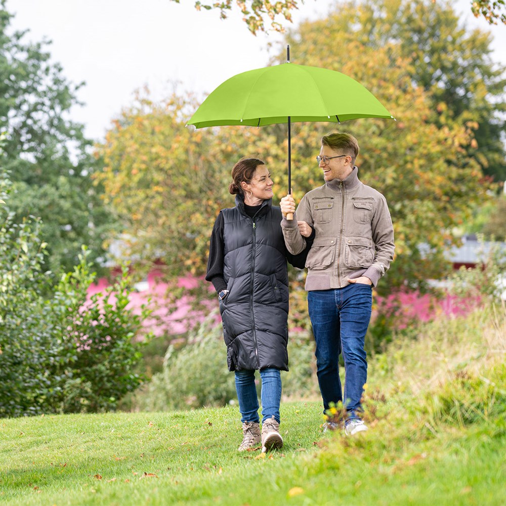 Preislich attraktiver nachhaltiger Gästeschirm mit Bezug aus recycelten Kunststoffen und Echtholzelementen Komfortable Automatik-Funktion zum schnellen Öffnen, hochwertiges Windproof-PLUS-System für eine maximale Gestell-Flexibilität bei stärkeren Windböen, flexible Fiberglasschienen, wassersparend gefärbtes Polyester-Pongee waterSAVE® Bezugsmaterial aus recycelten Kunststoffen, mit waterSAVE®-Label auf dem Schließband, Echtholzspitzen, gerader Echtholzgriff mit Werbeanbringungsmöglichkeit, höherer Korrosionsschutz durch schwarze Galvanisierung des Stahlstocks