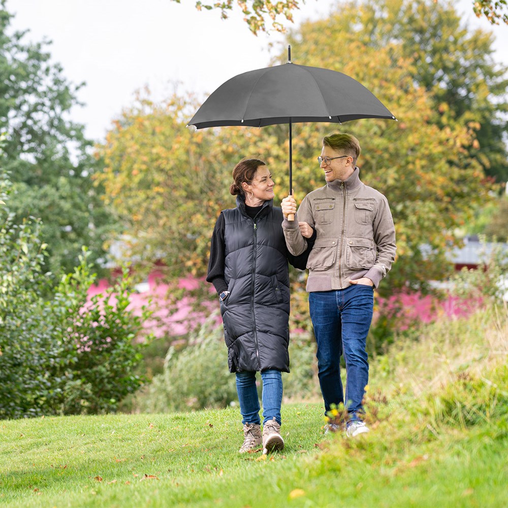 Preislich attraktiver nachhaltiger Gästeschirm mit Bezug aus recycelten Kunststoffen und Echtholzelementen Komfortable Automatik-Funktion zum schnellen Öffnen, hochwertiges Windproof-PLUS-System für eine maximale Gestell-Flexibilität bei stärkeren Windböen, flexible Fiberglasschienen, wassersparend gefärbtes Polyester-Pongee waterSAVE® Bezugsmaterial aus recycelten Kunststoffen, mit waterSAVE®-Label auf dem Schließband, Echtholzspitzen, gerader Echtholzgriff mit Werbeanbringungsmöglichkeit, höherer Korrosionsschutz durch schwarze Galvanisierung des Stahlstocks