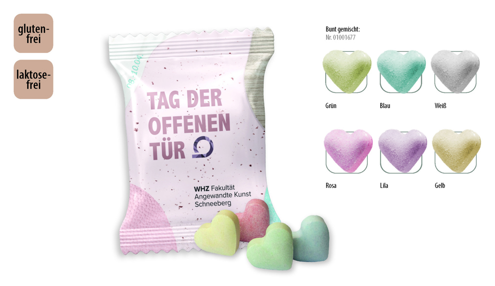 Traubenzuckerherzen bunt Werbetüte 4 Stück , Inhalt: Traubenzuckerherzen bunt