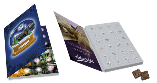 Tisch-Adventskalender in Buchform. Der Buchumschlag und der innenliegende Adventskalender werden entsprechend Ihren Wünschen 4-farbig bedruck. Ihre Werbung bleibt ungestört auch wenn alle Türchen geöffnet wurden.