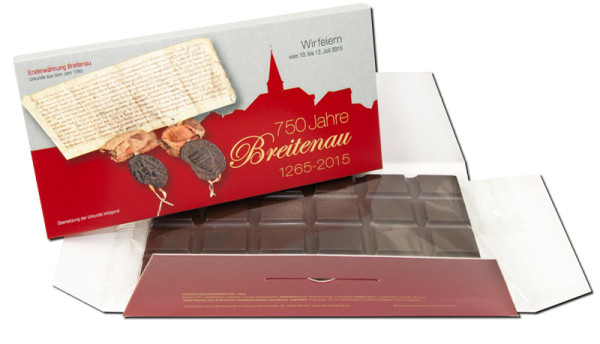 Einen 4-fbg. bedruckte Umschlag gefüllt mit: 100 g Schokoladentafel in Confiserie-Qualität... mehr