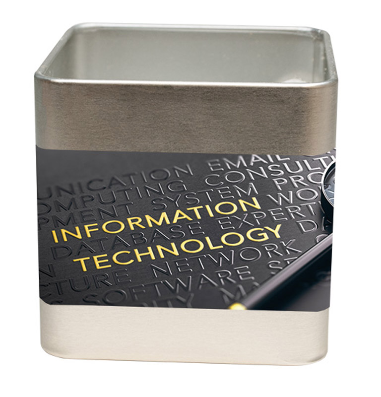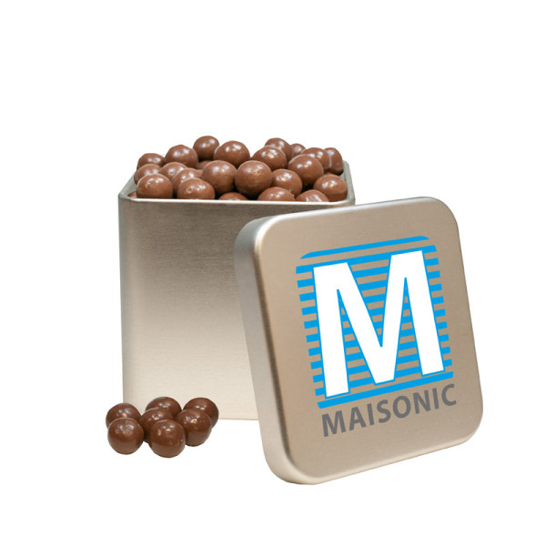 Silbermatte, quadratische Dose mit drei Veredelungsoptionen: Sie haben die Wahl zwischen Direkt-Digitaldruck auf dem Deckel, einem vierfarbigen 4-C-Etikett am Korpus oder einer Kombination aus beiden Veredelungen für maximale Markenwirkung. Befüllt wird diese kompakte Dose mit ca. 200g Knusperkugeln mit Schokolade dragiert, der Marke Brandt. Mit der KubiTin werden Sie einen süßen Nachgeschmack bei Ihren Kunden hinterlassen und bestimmt wird bald die nächste Bestellung folgen.