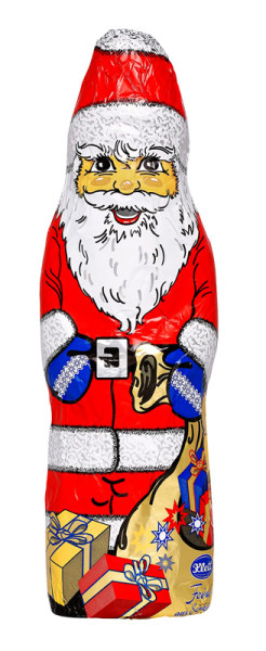 Schokolade-Weihnachtsmann als Hohlform, foliiert. Folie mit Standard Motiv bedruckt.