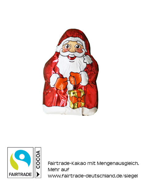 Schokoladen-Mini-Santa in bedruckter Folie. Fairtrade Edelvollmilchschokolade, mindestens 33% Kakao.