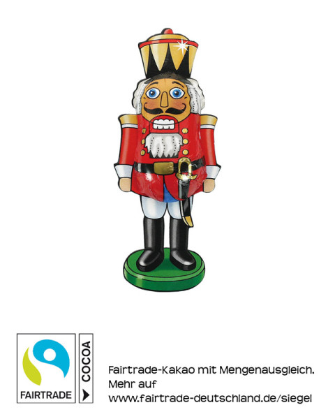 Schokoladen-Nußnacker in bedruckter Folie. Fairtrade Edelvollmilchschokolade, mindestens 33% Kakao.