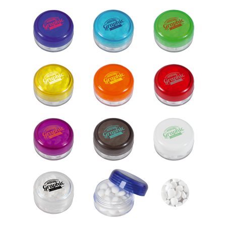 Runde Plastikdose ø45 x 25 mm., mit farbigem Deckel gefüllt mit ca.12 gr. extra strong Minties `Triangle`