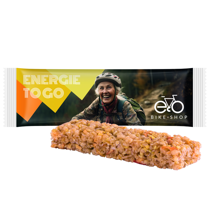Müsliriegel Multikorn Apfel in weißer Folie, individuell bedruckt. Inhalt: 1 Müsliriegel mit hochwertigen Getreidearten, Apfelstückchen und Rosinen, 25 g