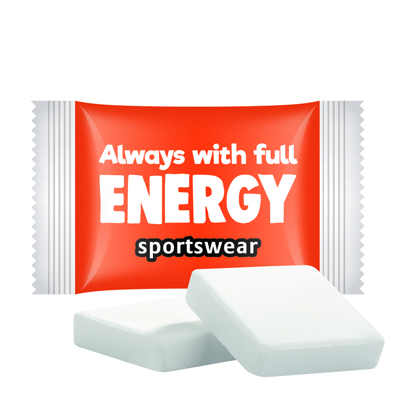 Traubenzucker in weißer Folie, individuell bedruckt. Inhalt: 1 Traubenzucker (quadratisch) mit Vitamin C (Apothekenqualität), 5 g