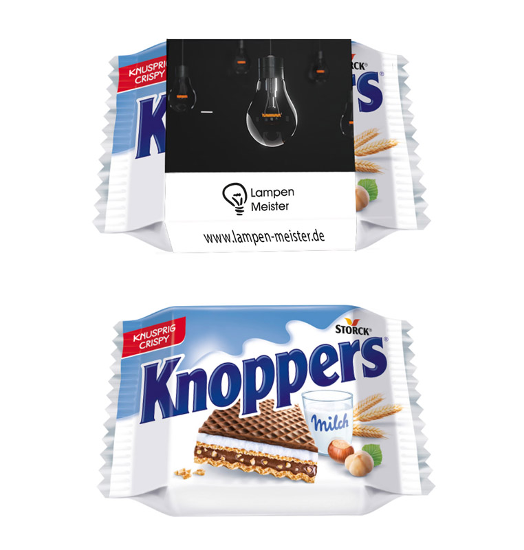 Knoppers-Haselnuss-Schnitte, original verpackt, im individuell bedruckten Werbeschuber. mehr