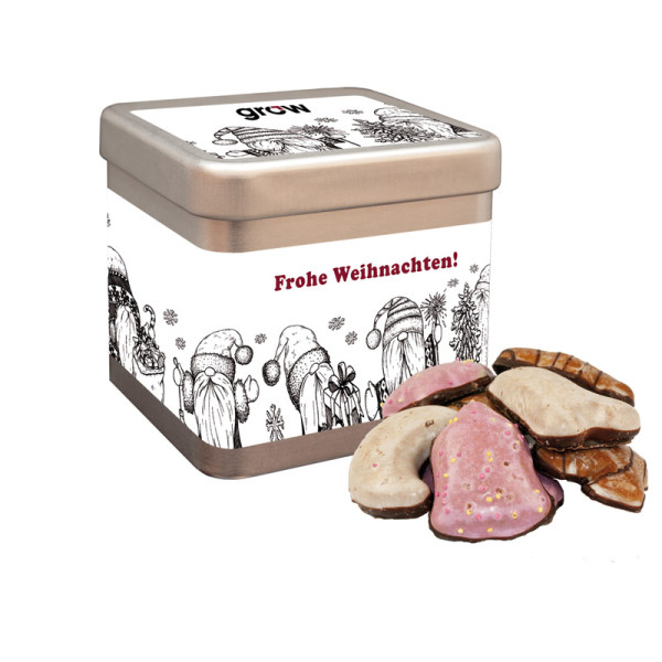 Silbermatte, quadratische Dose mit drei Veredelungsoptionen: Sie haben die Wahl zwischen Direkt-Digitaldruck auf dem Deckel, einem vierfarbigen 4-C-Etikett am Korpus oder einer Kombination aus beiden Veredelungen für maximale Markenwirkung. Eine bunte Lebkuchen-Mischung in verschiedenen Formen machen aus dieser Dose den Top-Seller unserer KubiTins für Werbeaktionen in den letzten Monaten des Jahres.
