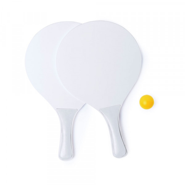 Beachball-Set mit zwei Schlägern aus Naturholz in Weiß. Mit verstärktem Griff in verschiedenen lebendigen Farben. Präsentiert in einer Netztasche mit Ball in passender Farbe.
