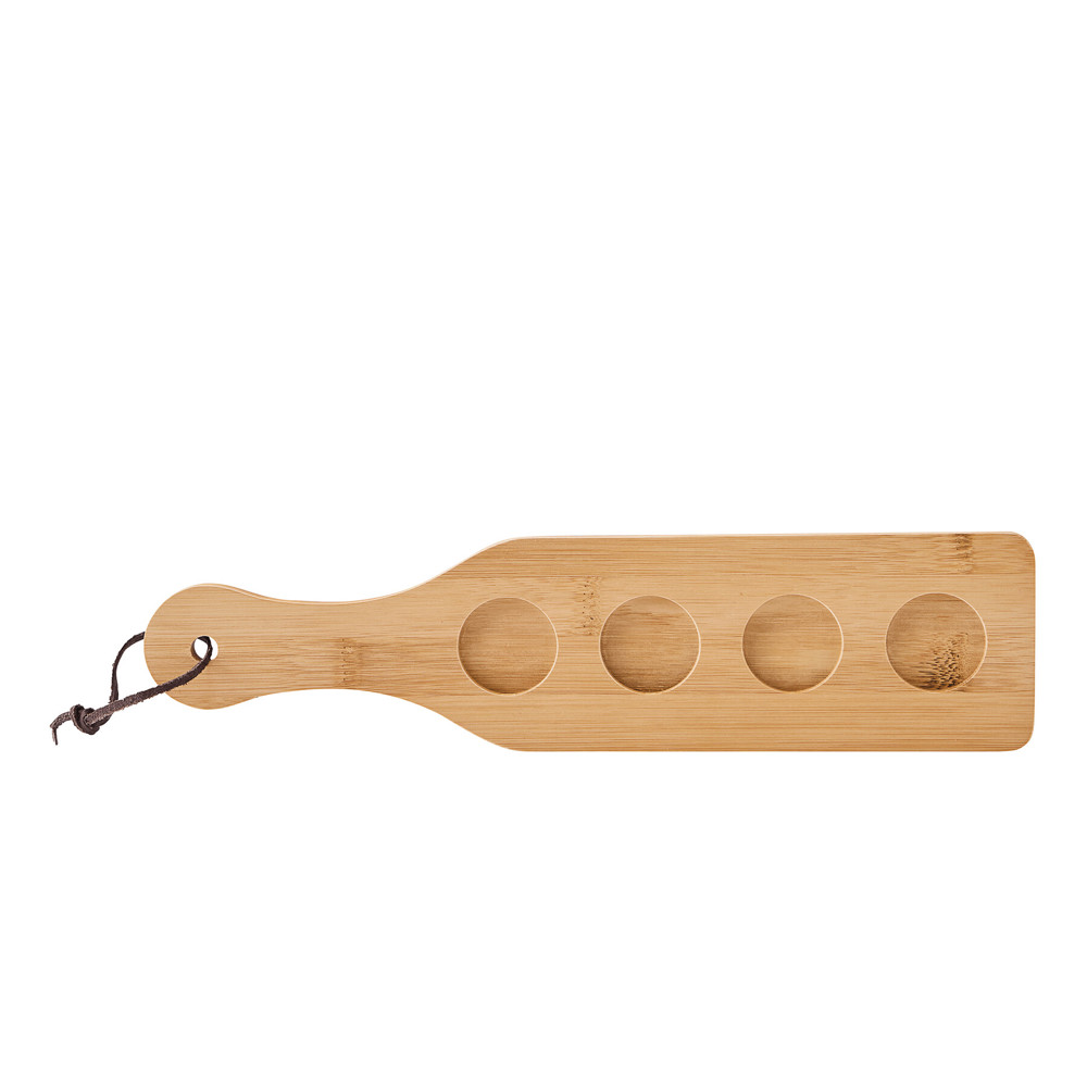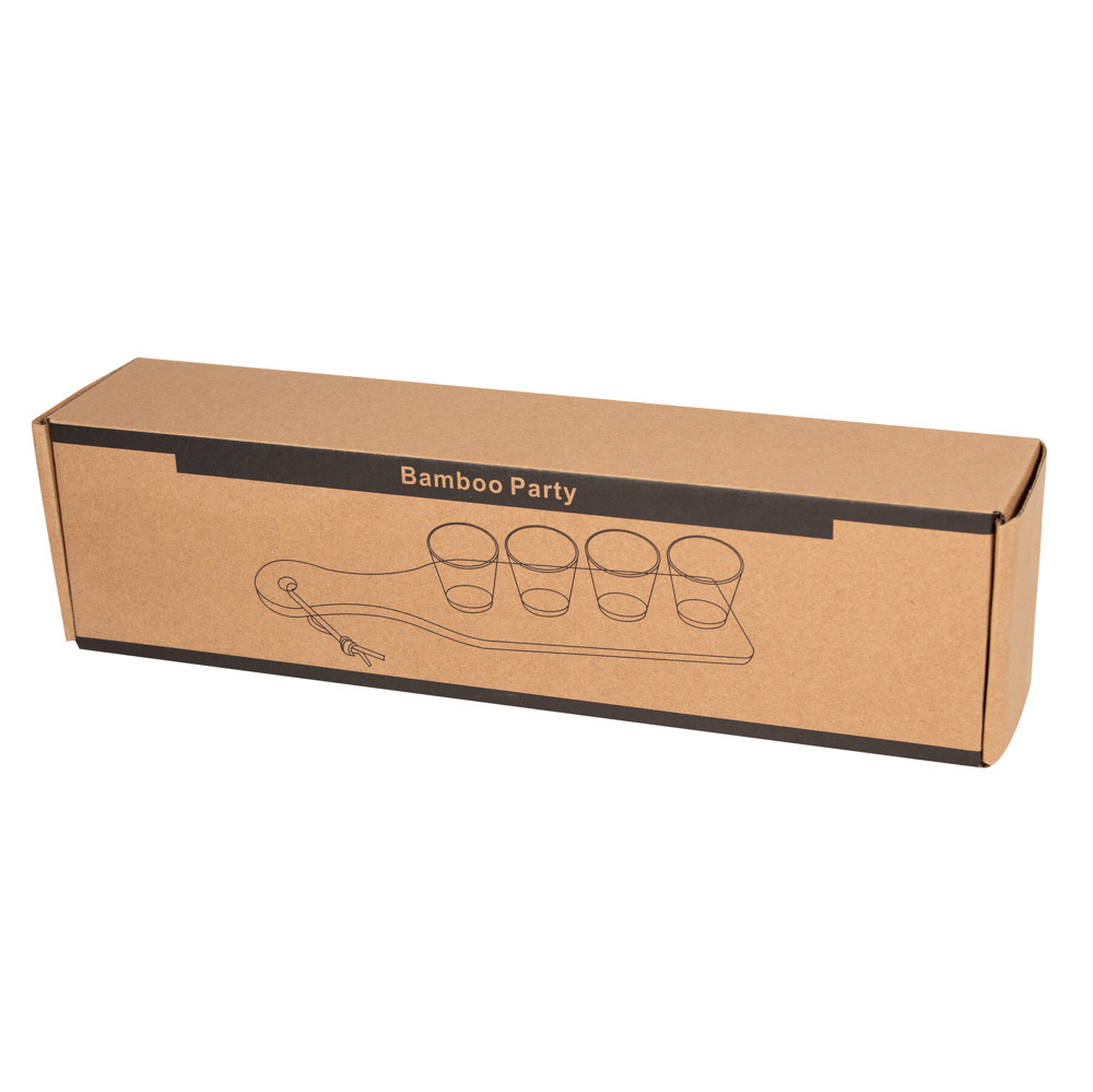 Gläser-Set BAMBOO PARTY: 4 Schnapsgläser (je 6 cl) auf Bambus-Holzbrett, Vertiefungen im Tablett geben den Schnaps-Gläsern einen sicheren Halt, mit Aufhängeband aus Leder, in Box