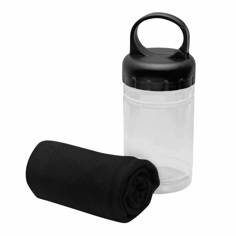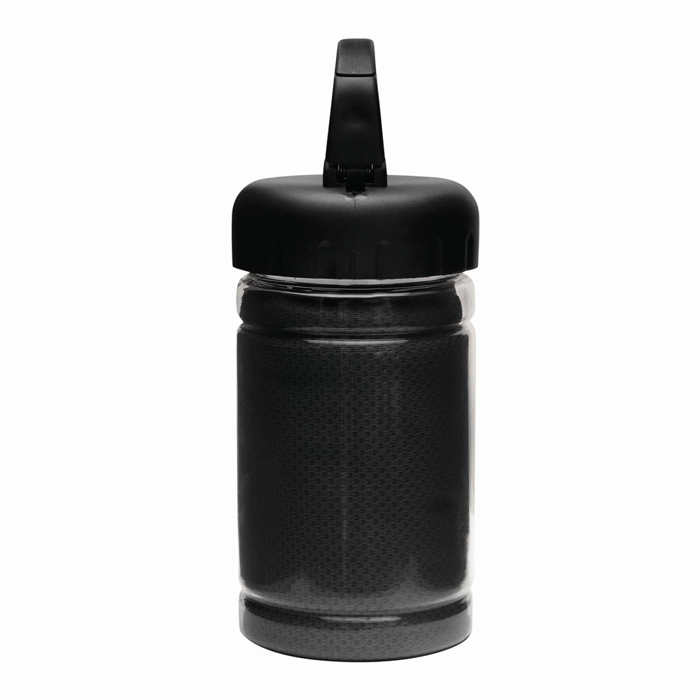 Kühlhandtuch CHILLING: in transparenter Dose, integrierter Sonnenschutzfaktor, für einen lang anhaltenden Kühleffekt Handtuch mit Wasser befeuchten und schleudern oder Wasser zur Dose hinzugeben und gut schütteln, Deckel mit Karabinerhaken (der Karabiner ist NICHT als Sicherung beim Klettern geeignet) - ideal für Fitness und Sportaktivitäten
