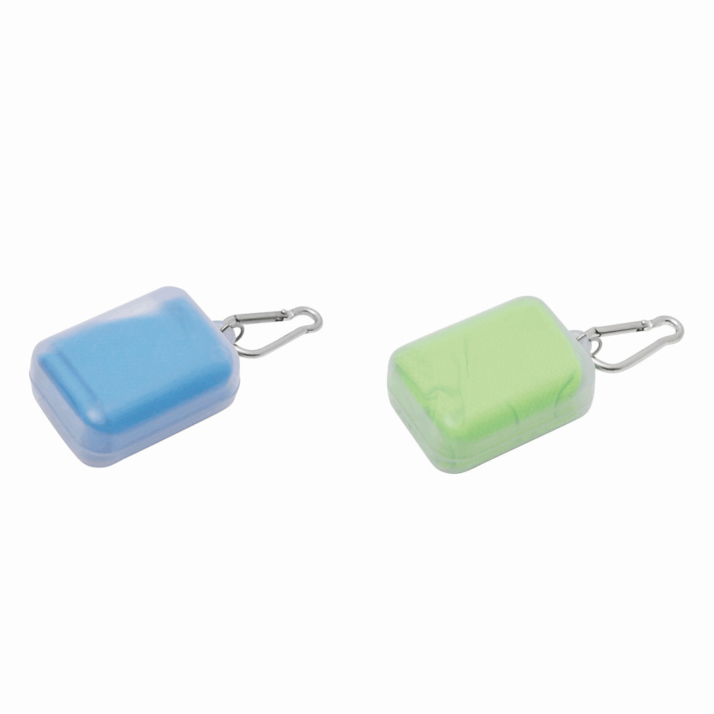 Mikrofaser-Kühlhandtuch COOL DOWN mit Aufhängeöse, in transparenter Dose mit Karabinerhaken: für einen lang anhaltenden Kühleffekt Handtuch unter Wasser halten, auswringen und in der Luft schwingen - ideal für Fitness und Sportaktivitäten (der Karabiner ist NICHT als Sicherung beim Klettern geeignet)