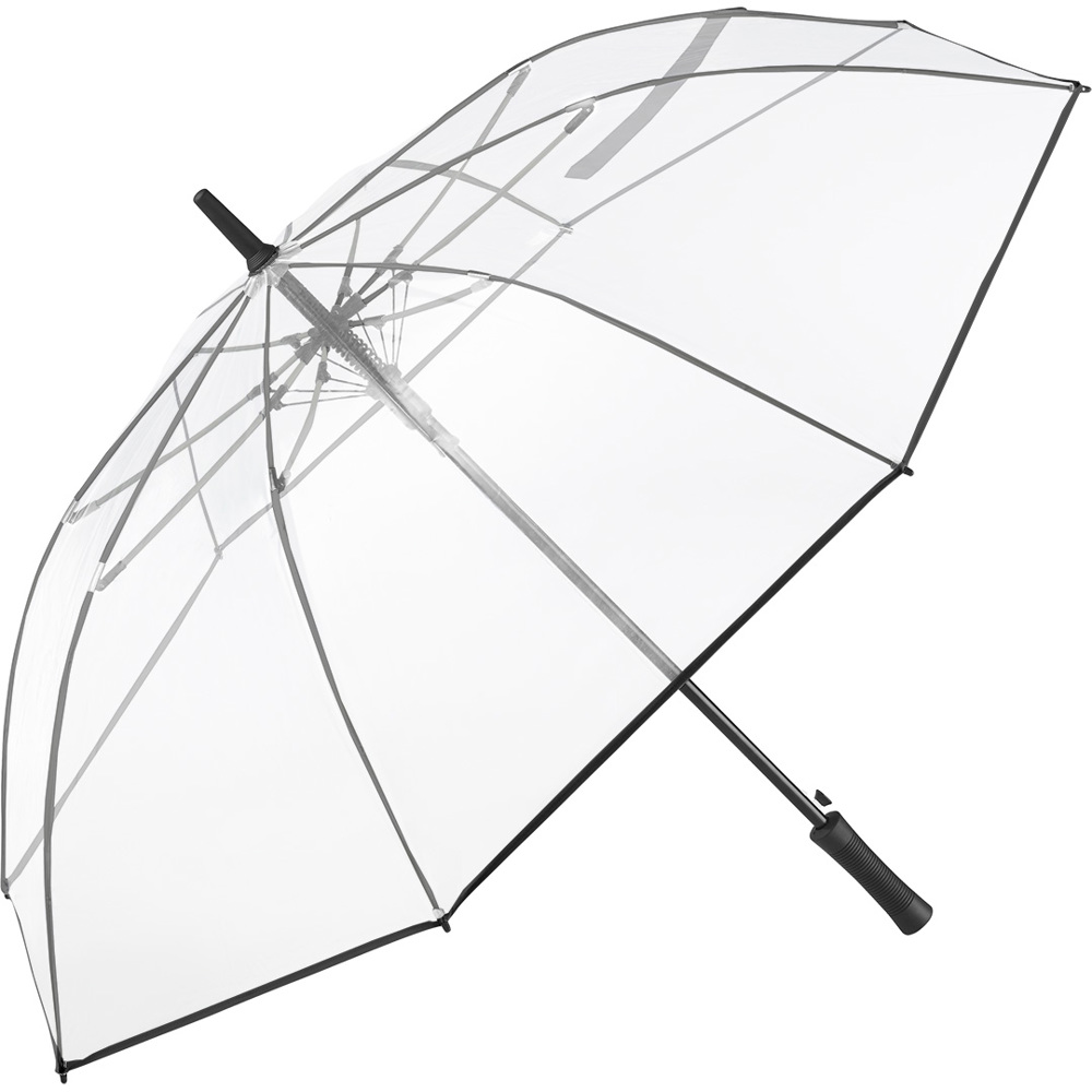 Ansprechender Automatik-Gästeschirm für zwei Personen mit transparentem Bezug und farbigen Details Komfortable Automatik-Funktion zum schnellen Öffnen, hochwertiges Windproof-PLUS-System für eine maximale Gestell-Flexibilität bei stärkeren Windböen, flexible Fiberglasschienen, farblich aufeinander abgestimmte Design-Elemente, matt-schwarzer gerader Kunststoffgriff mit Werbeanbringungsmöglichkeit, höherer Korrosionsschutz durch schwarze Galvanisierung des Stahlstocks