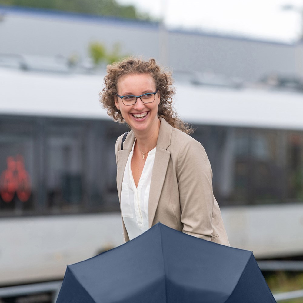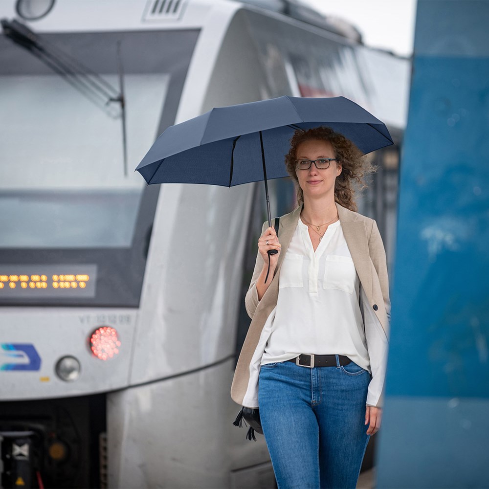 Preislich attraktiver Handöffner-Taschenschirm Einfache Handhabung durch Sicherheitsschieber, Windproof-System für höhere Gestell-Flexibilität und bessere Windsicherheit, Soft-Touch-Griff mit elastischer Tragekordel und Werbeanbringungsmöglichkeit