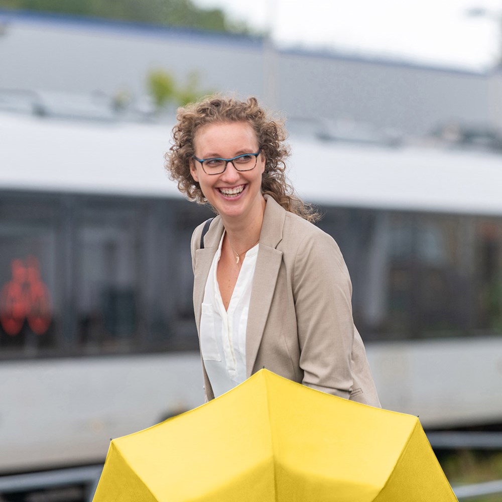 Preislich attraktiver Handöffner-Taschenschirm Einfache Handhabung durch Sicherheitsschieber, Windproof-System für höhere Gestell-Flexibilität und bessere Windsicherheit, Soft-Touch-Griff mit elastischer Tragekordel und Werbeanbringungsmöglichkeit