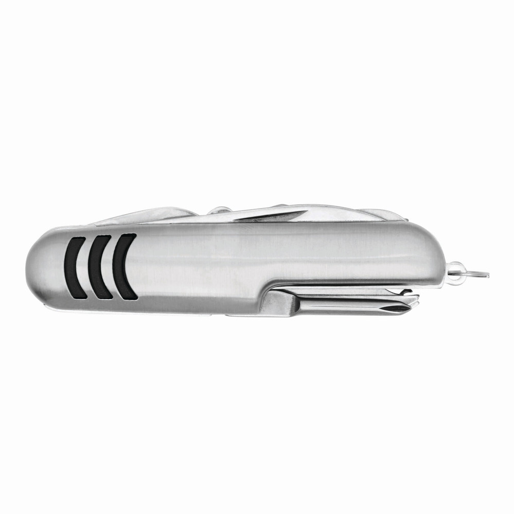 Taschenmesser TRIO in Streifen-Optik: mit Dosenöffner, Flaschenöffner, Korkenzieher, Nagelfeile, Kreuzschlitzschraubendreher, Schere, Säge, Entschupper, Lochstecher, Ahle mit Schlüsselring, in Box