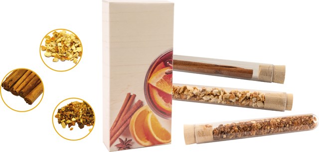 Eine Zimtstange, Glühweingewürz und Orangenschalen sind die perfekten Zutaten für einen leckeren Glühwein oder für besonderes Weihnachtsgebäck. Nutzen Sie die Packung im Standardmotiv für Ihre Werbebotschaft oder, ebenfalls ab 250 Stück, für Ihre individuelle Gestaltung.