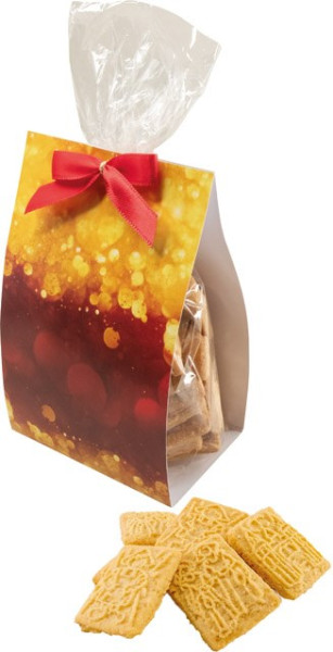 Im transparenten Beutel befinden sich ca. 100 g leckere und hochwertige Butterspekulatius. Ein süßes weihnachtliches Giveaway über das sich Ihre Kunden freuen werden. Die Banderole bietet viel Platz für Ihren Werbeeindruck oder, ebenfalls ab 100 Stück, für eine individuelle Gestaltung.