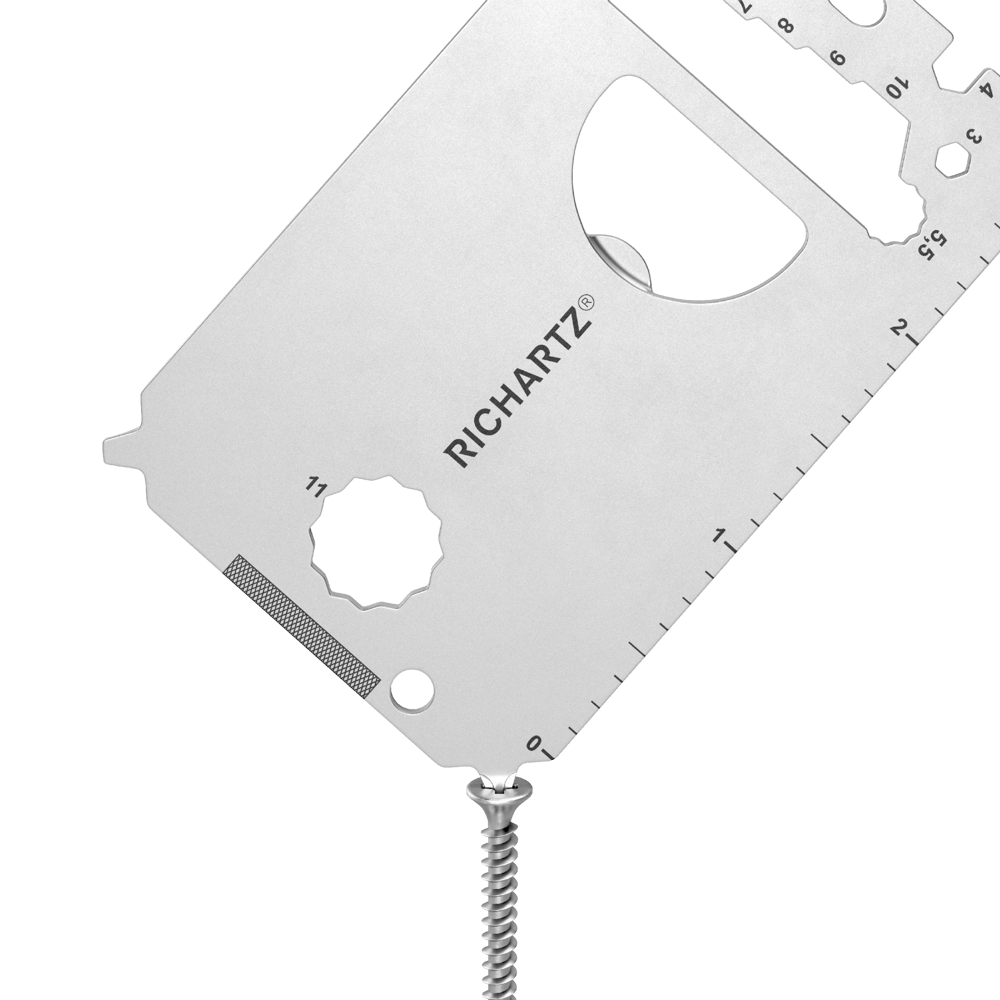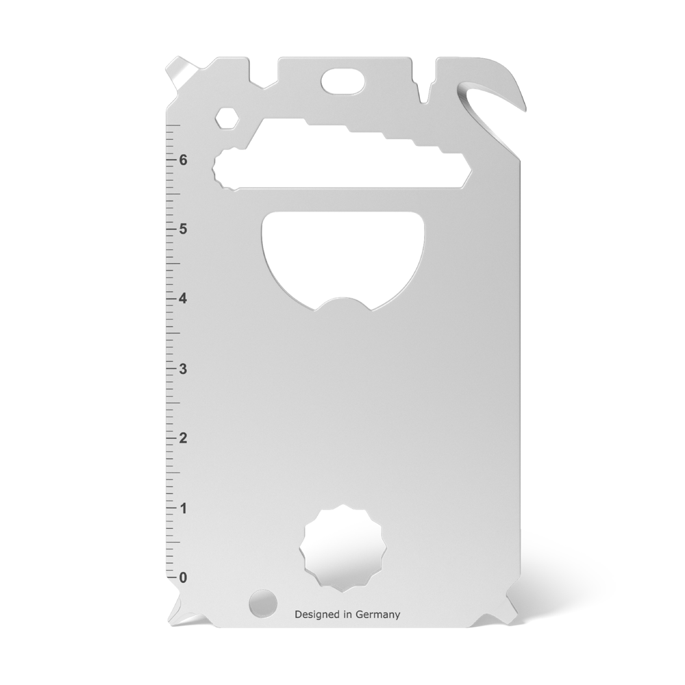 23 Nothelfer im Visitenkartenformat sorgen für Deinen sorgenfreien Alltag. Klingt wie Werbeprosa? Nun gut, hier nochmal in Zahlen - für unsere Fakten-Fans: Kapselheber, 3 Schlitzschraubendreher, Kreuzschlitzschraubendreher, Brief-/Paketöffner, 7 Sechskantschlüssel, 2 Vielzahnschlüssel, 2 Speichenschlüssel, Nagelzieher, Nagelfeile, Zentimetermaß, Inchmaß, 2 Ringösen. Und das alles in schöner Form, auf wenigen Zentimetern. Noch Fragen?