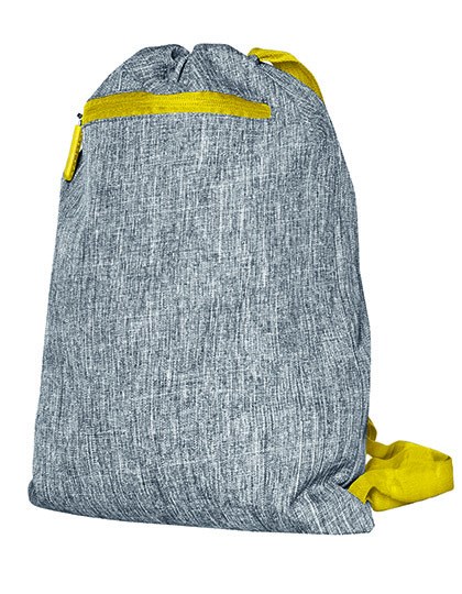 600D Polyester Sportbeutel in Grey Melange | Ein Hauptfach, das durch Zuziehen der seitlichen, farbigen Schulter-Trageriemen verschlossen wird | Ein Reißverschluss-Fach auf der Front | Reißverschluss passend zum farbigen Trageriemen mit farbigem Gummi Zipp-Puller mit „bags2GO“-Prägung | Volumen: ca. 3 Liter | Lieferung ohne Inhalt/Deko