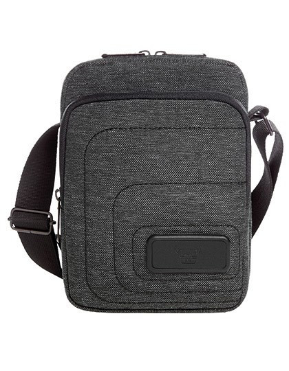 Polyester 900d | Kleine, gepolsterte Umhängetasche | Hauptfach mit 2-Wege-Reißverschluss | Reißverschluss-Vortasche mit aufwändig gesteppter Front und Kunststoffemblem für Ihr Logo | Rückseitig flaches Einsteckfach | Längenverstellbarer Schultergurt mit wertigen Metall-Accessoires | Lieferung ohne Inhalt/Deko | Kapazität: 1 Liter