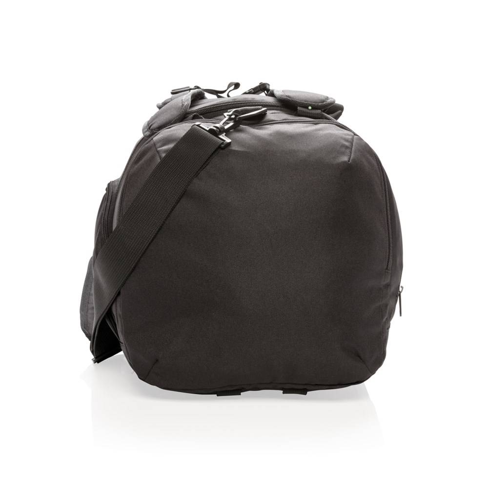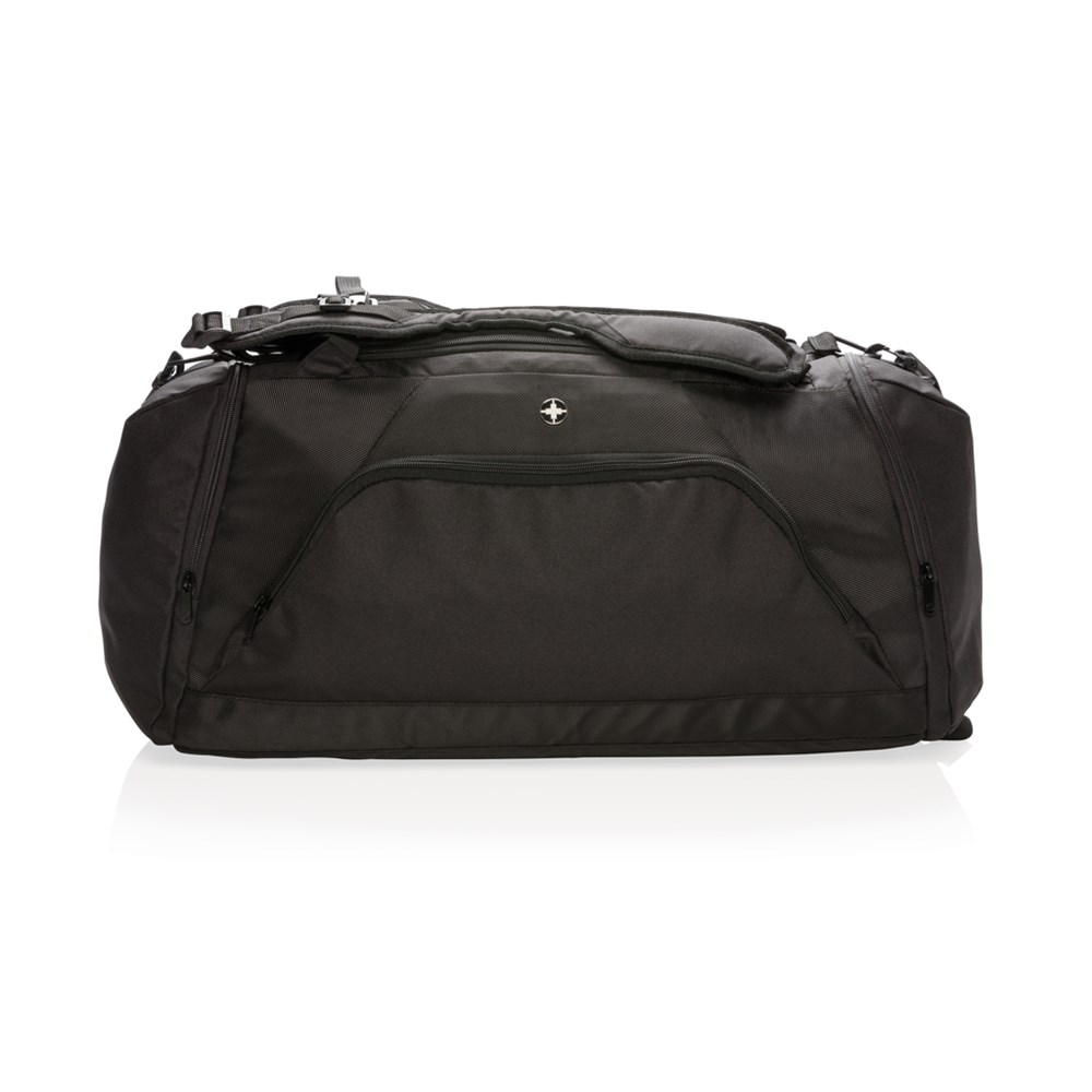 Leichte Multifunktionstasche aus 1680D und 600D Polyester. Kann sowohl als Rucksack sowie als Wochenendtasche gebraucht werden. Die Tasche verfügt über einen großen Innenraum im Hauptabteil mit einem U-förmigen Reißverschluss, einem Schuhfach und einer Seitentasche mit Reißverschluss. Auf der Rückseite befindet sich ein separates Fach für Ihre Flasche. Die Fronttasche mit Reißverschluss verfügt über einen extra RFID Schutz. Die Schultergurte sind verstellbar und gewähren somit besten Tragekomfort. PVC-frei.