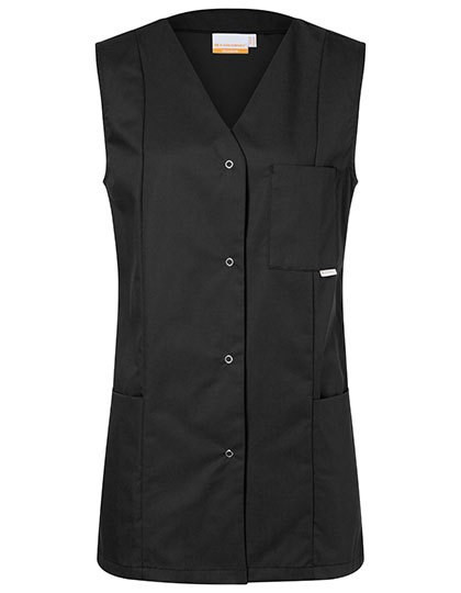 Köpergewebe, 215 g/m² | Hochveredelt, gekrumpft, waschecht, pflegeleicht | Damenkasack in lockerer Passform | Englische Nähte | V-Ausschnitt, ohne Ärmel | 2 versteckte Seitentaschen | 1 aufgesetzte Brusttasche links | 4 Druckknöpfe | Rückenlänge bei Größe 38 ca. 82 cm | Industriewäschetauglich | Bis 95°C waschbar