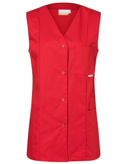 Köpergewebe, 215 g/m² | Hochveredelt, gekrumpft, waschecht, pflegeleicht | Damenkasack in lockerer Passform | Englische Nähte | V-Ausschnitt, ohne Ärmel | 2 versteckte Seitentaschen | 1 aufgesetzte Brusttasche links | 4 Druckknöpfe | Rückenlänge bei Größe 38 ca. 82 cm | Industriewäschetauglich | Bis 95°C waschbar