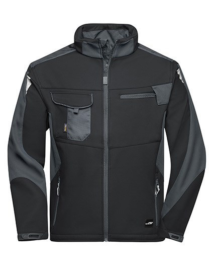 Robustes, strapazierfähiges Softshell-Material | Wind- und wasserabweisend (2.000 mm Wassersäule) | Atmungsaktiv und wasserdampfdurchlässig (2.000 g/m²/24h) | Stehkragen | Schulterbereich mit CORDURA® verstärkt | Durchgehend unterlegter Reißverschluss mit Windschutzblende | Seitentaschen und Brusttasche mit Reißverschluss | Brusttasche mit Klappe, Innentaschen | Reflektions-Elemente (ohne Schutzfunktion/keine PSA) am Arm und Rückenteil