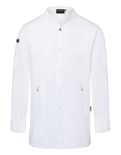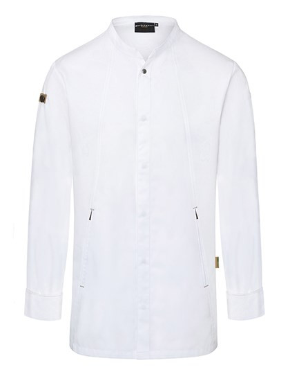 Vorderseite: Köpergewebe, 150 g/m² | Rückseite: Jersey-Piqué, 170 g/m², atmungsaktiv, feuchtigkeitsregulierend | Innovative nachhaltige Kochjacke, die urbanen Style mit natürlichem Flair verbindet | Der Artikel enthält 72% recyceltes Polyester und wurde umweltverträglich und sozial verantwortlich produziert | Leicht tailliert geschnitten | Rückeneinsatz aus Jersey-Piqué sorgt für angenehme Belüftung und erhöhte Bewegungsfreiheit | mit Druckknöpfen zum schnellen Öffnen und Schließen | Ärmelmanschetten mit Druckknöpfen | Vorderteil mit Reißverschlußtaschen und Leistentasche am linken Ärmel | stylische Applikationen aus Kontrastbändern an den Ärmeln und im Nacken für eine urbane Optik | Grüner Knopf zertifiziert, www.g-k.eu/karlowsky